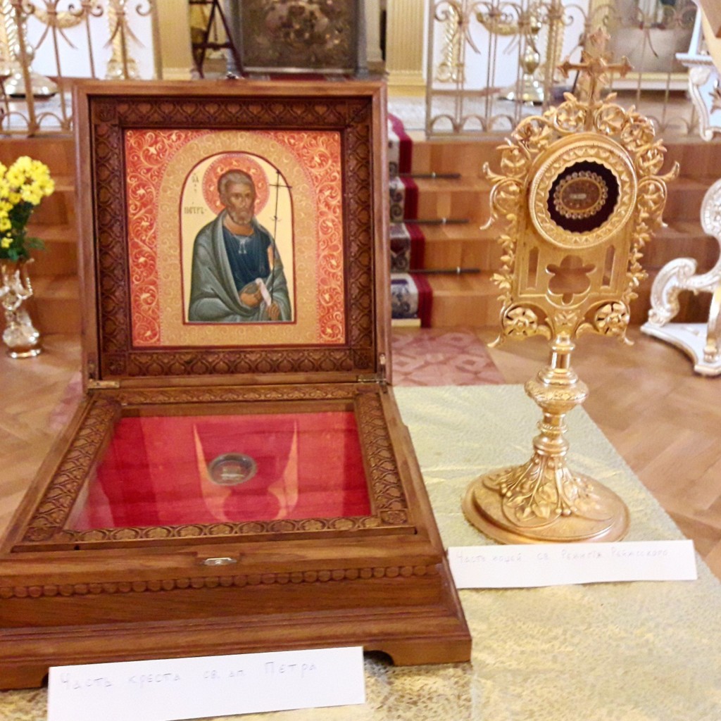На поклонение верующим перед Божественной Литургией в храме Св. апп. Петра и Павла были выставлены: ковчег с частью Креста, на котором был распят Св. апостол Петр, реликварий с частью мощей Св. Реминия Реймсского, а также икона с мощами Св. апостолов. Святыни передал благотворительный фонд «Триумф Сердца».